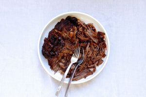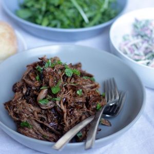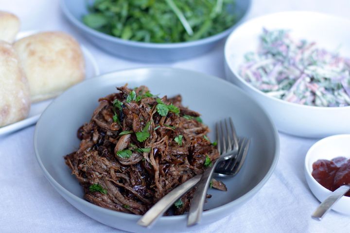 Remove beef to a plate and use two forks to shred, or pull, the meat. Return to slow cooker and combine with the oniony sauce that remains. Serve with crusty bread rolls, coleslaw and good-quality barbecue sauce.